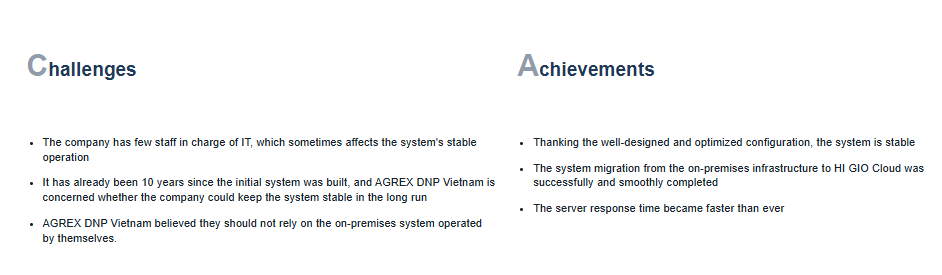 AGREX DNP Vietnam Co., Ltd. – (Providing BPO services). It has already been 10 years since the initial system was built, and AGREX DNP Vietnam is concerned whether the company could keep the system stable in the long run. The company wished to rebuild its IT environment to continue its business operations with peace of mind.