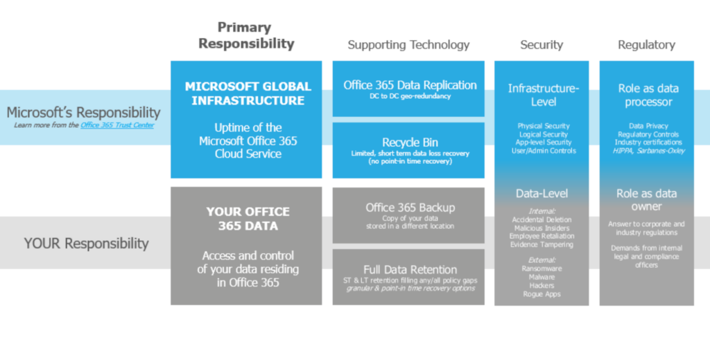 Even though Microsoft 365 is a cloud service, it doesn’t replace your responsibility to back up business-critical Office 365 data. The Office 365 Shared Responsibility Model states that with Microsoft 365, it’s your data — you control it — and it is your responsibility to protect it.
