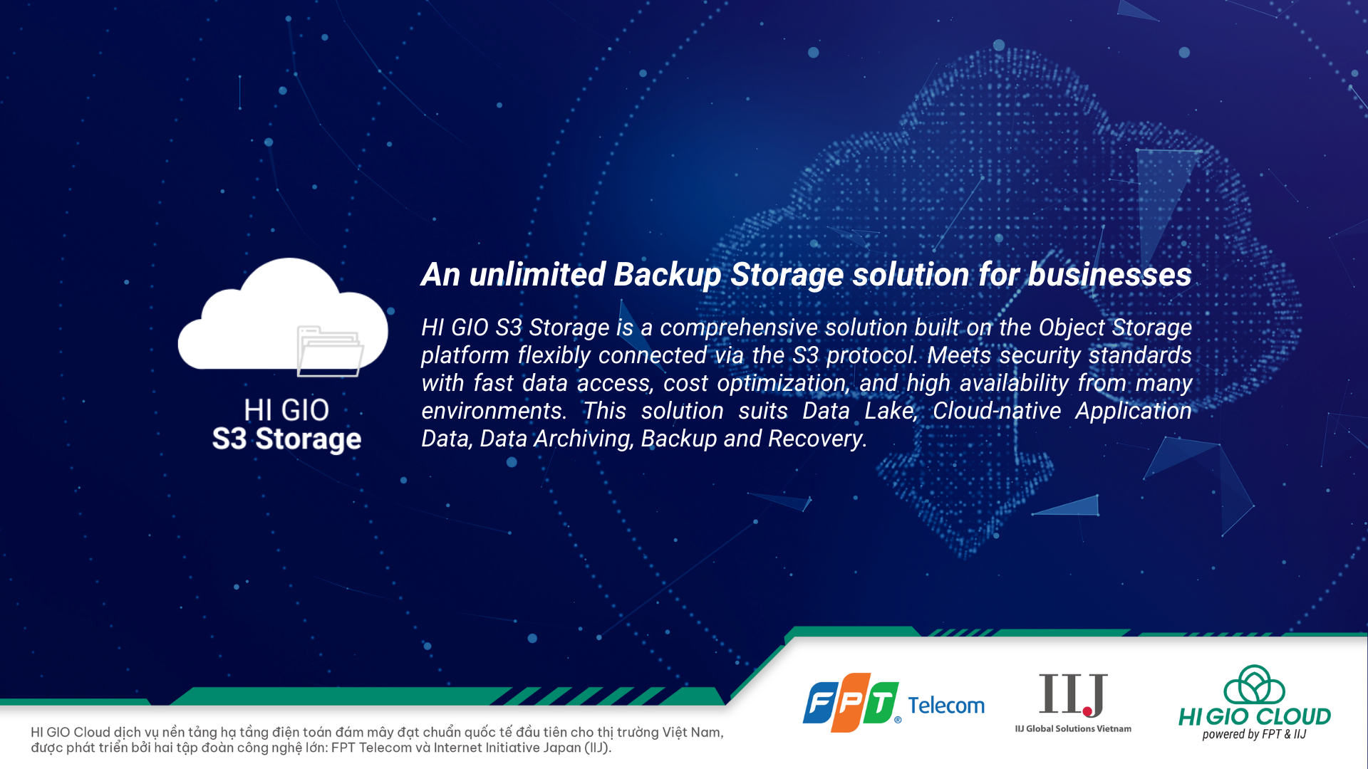 HI GIO S3 Storage is a comprehensive solution built on the Object Storage platform flexibly connected via the S3 protocol. Meets security standards with fast data access, cost optimization, and high availability from many environments. This solution suits Data Lake, Cloud-native Application Data, Data Archiving, Backup and Recovery.